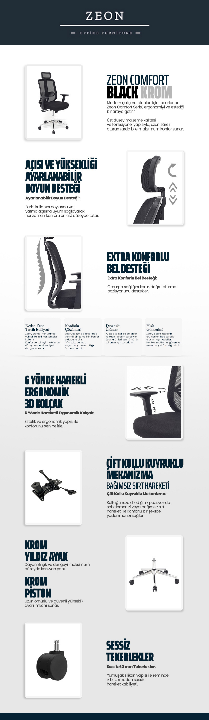 ZEON Büro Ofis Sistemleri // Comfort Ofis Koltuğu Makam Koltuğu Çalışma Koltuğu Müdür Koltuğu Paket İçeriği Ayarlanabilir Başlık ; Ergonomik bel desteği ; 3D Yumuşak dokulu kolçak ; İstediğin konumda kitlemenizi ve serbest bir şekilde yaylanmanı sağlayan Zeon Büro Ofis Çift Kollu Kuyruklu Mekanizma ; Class 3 100 lük Zeon Büro Ofis Sistemleri Piston 25,5 mm minimum 35,5 mm maksimum boy ; 1,2 mm kalınlığında demir pim yuvalı ekstra dayanıklı konik yıldız ayak ; Ø60 Sessiz silikon yapısıyla tekerlek ; 120 KG taşıma kapasitesi ; 24 ay ürün garantisi ;